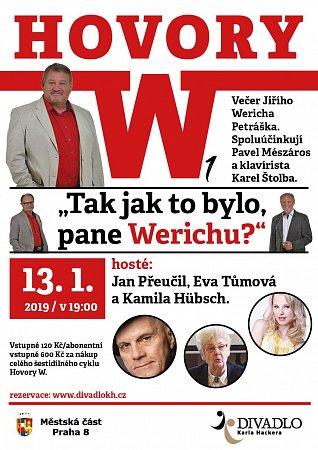 První večer cyklu 6 pořadů Hovory W, které budou probíhat vždy 13. každého měsíce až do června. Vstupné 120 Kč/abonentní vstupné 600 Kč při nákupu celého cyklu. Abonentku koupíte přes ikonu "Abonentky" na horní liště naší základní plochy.