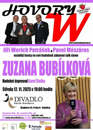 HOVORY W – host IVO ŠMOLDAS. Jiří Werich Petrášek a Pavel Mészároš uvádějí hosty ve své hudebně zábavné talk show. Hudební doprovod Karel Štolba. Vstupné 250/200 Kč. Pronájem otevřený veřejnosti.