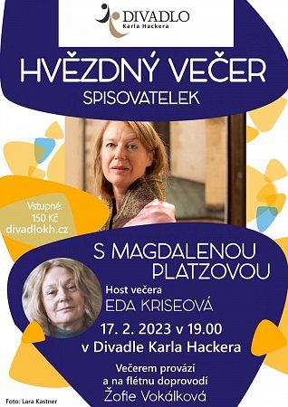 Večer se spisovatelkou a novinářkou Magdalenou Platzovou. Hostem bude Eda Kriseová, večerem provází a na flétnu doprovodí Žofie Vokálková.