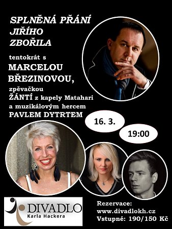 Neopakovatelný večer nezaměnitelného hlasu české populární hudby Marcely Březinové a jejího hosta zpěvačky Žántí z kapely Matahari. Dalším hostem bude muzikálový herec Pavel Dytrt. Máte se na co těšit.